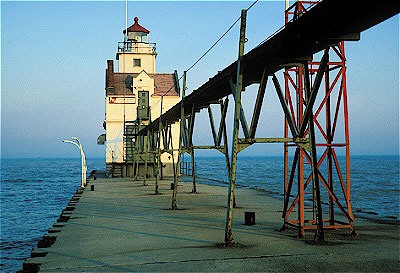 Kewaunee Pierhead Light (1909) with catwalk (since removed) and Lake Michigan