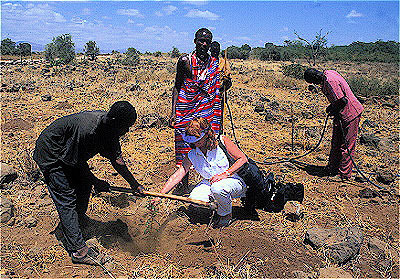 Tourists planting young tree as part of re-forestation project Amboseli National Park Namanga, Kenya