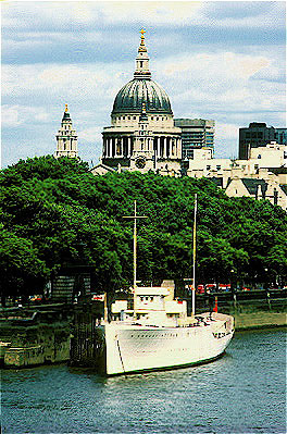 Thames River w/St Paul's Cathedral and HMS Wellington London, England
