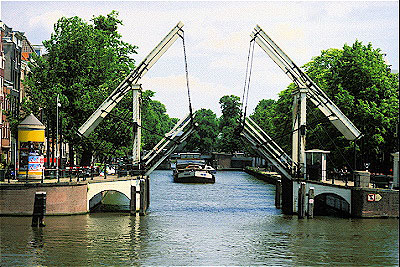 Amstel River looking toward the Niewe Herengracht Canal with opening counterposed bridge Amsterdam, Netherlands
