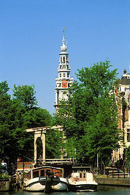Amstel River looking toward the Groenbrugwal Canal & Kuider Kerk Amsterdam, Netherlands