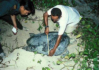 Green Sea Turtle Chelonia mydas Ranger Measuring Female Turtle Islands Park, Selingaan Island Sabah, Malaysia