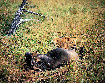 African Lions with Prey Panthera leo Masai Mara National Reserve Kenya